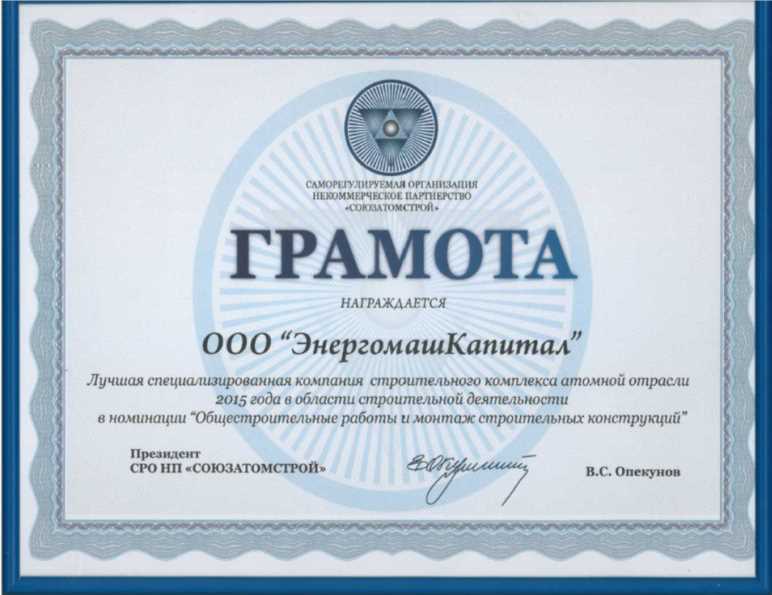НОВОСТИНа Форуме «Атомекс-2015» ООО «ЭнергомашКапитал» получило почетную грамоту от лица СРО НП «СОЮЗАТОМСТРОЙ» Почетную грамоту в номинации «Общестроительные работы и монтаж строительных конструкций» Генеральному директору ООО «ЭнергомашКапитал» Мешалкину В.В. вручил президент отраслевых СРО, советник генерального директора Госкорпорации «Росатом» В.С. Опекунов, отметив, что ООО «ЭнергомашКапитал» стала одной из немногих инжиниринговых компаний, занимающихся строительно – монтажными работами, поставками материалов на энергообъекты России, которая была удостоена награды и признания на столь высоком уровне.    ![]()    ![]() |